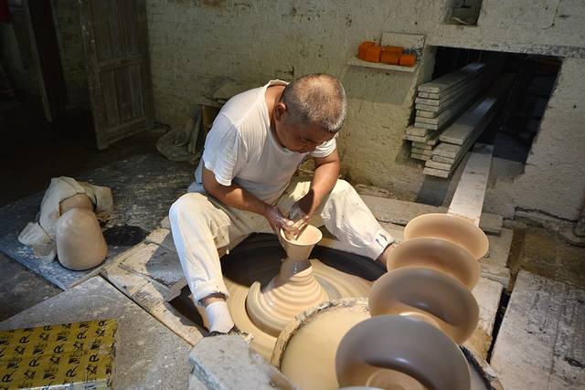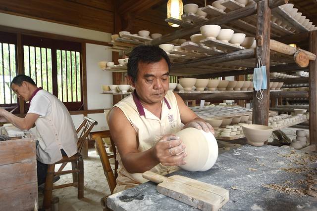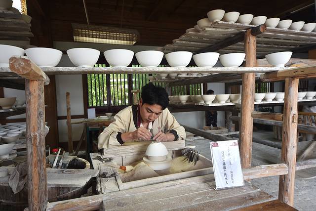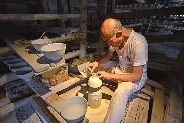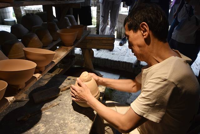 经过“风火仙师”童宾像,我们在手工制瓷作坊停下了脚步。明代宋应星在《天工开物》中这样写道:“共计一坯之力,过手七十二,方克成器。其中微细节目,尚不能尽也。”景德镇制瓷72道工序由此而来。在这里我们看到了传统的制瓷工艺展示,加工好的泥料经过拉坯、 利坯、施釉、画青花等一道道工序渐渐成型,工匠师傅们熟练高超的技艺让我们大开眼界,一块块泥巴在他们手中加工成了一件件精美的艺术品。