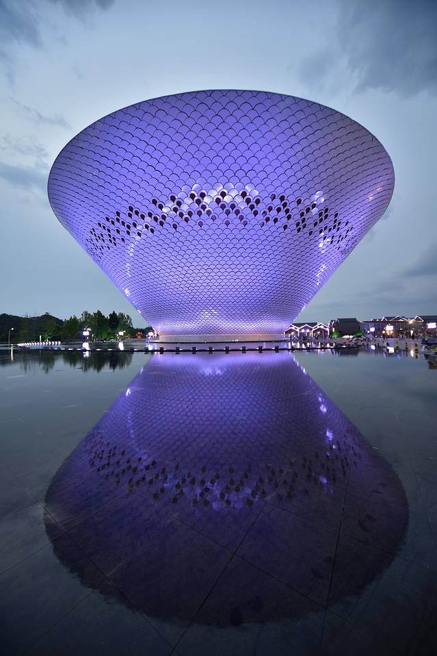 昌南里艺术中心“大碗”的造型灵感来自于宋代湖田窑影青斗笠碗,寓意“万瓷之母”。艺术中心建筑面积约1万平方米,共4层,层高8~10米,中庭采用全挑空结构,设置了3个1000~3000平方米的专业展厅,提供约5500平方米展览空间,为开展销售、展示、培训、创作、拍卖等陶瓷文化活动提供了宽敞优雅的空间。“大碗”外墙采用纳米喷涂铝单板,呈鳞片状叠瓦式布置,通过灯光的投射,“大碗”外面共呈现八种颜色,还可以通过4D技术投影出变幻多样的图案。