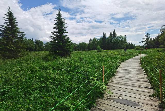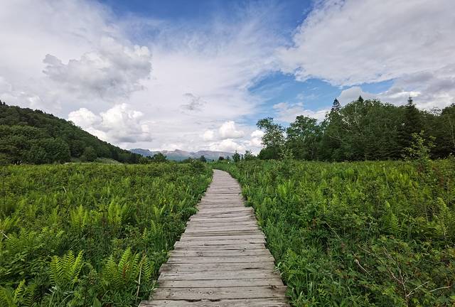 通往王池的步行栈道,栈道两边围挡起来,有提示牌,提醒你不要去采摘路边花草,更不要翻越栈道,沼泽地里面有蛇出没,注意人身安全。