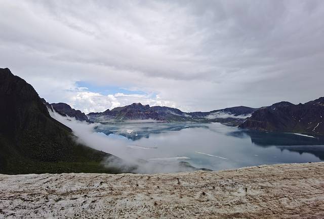 天池边上的积雪,最厚处足足有几十厘米深,乌云笼罩下的天池,远处的蓝天白云煞是漂亮,倒影到天池,更是给天池赋予了无限美意。