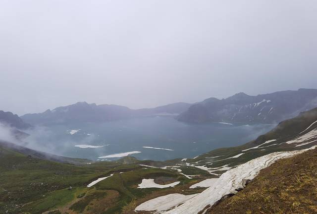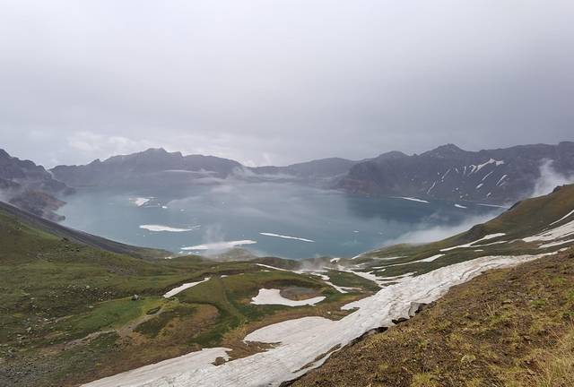 已经是6月底了,天池内的冰雪还没有完全融化。