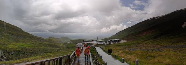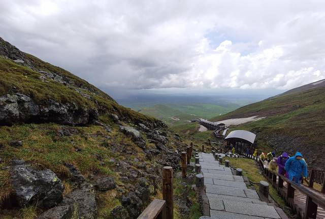 远处就是山腰间的游客服务中心,大家都购买了一次性雨衣,怕冷的还租了一件棉衣,山上确实冷。因为要爬1400个台阶,大家准备好行装,带点吃的,开始往西坡主峰走去。
