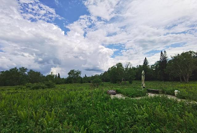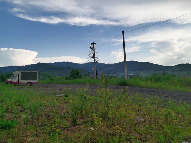 停车场相反方向蓝天白云,晴空万里。真是两重天,工作人员说长白山的天气多变,经常性的山上下大暴雨,山下天气晴朗。