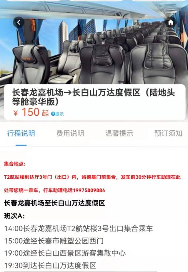 10:15乘坐川航3U8857,当日12:45落地长春龙嘉机场。因为去之前,已经做好了攻略,关注吉林省景区直通车,购买长春龙嘉机场到长白山西景区(陆地头等舱豪华版),每人130元,小孩也是全票,到达长白山万达度假区是每人150元,开车前12小时内票不退可以改签,但每天机场仅下午14:00一班,下午19:00到达长白山西坡景区。