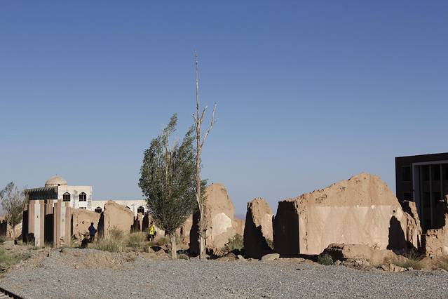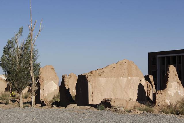 沿黑山戈壁继续前行3.5公里,拐个弯右手边一片废墟呈现眼前,传说中的冷湖石油小镇到了。冷湖石油小镇,位于如今的青海省海西州冷湖镇,距离西宁900多公里,距离州府德令哈400多公里,处于青、新、甘交界处,距离最近的铁路站柳园340多公里,是一座因石油而兴又因石油而亡的小镇。上世纪因为钻头在“地中四井”钻至一定深度时,原油喷涌而出,据说连喷了3天3夜,自此冷湖成为当时中国的四大油田之一开始了它的辉煌一页。随着石油的发现石油人拖家带口来到冷湖,形成了一个人口四五万人的超级小镇,灯火辉煌,热闹繁华,被称为“西北小香港”。随着敦煌石油的发现,冷湖石油又渐渐枯竭,曾人们都陆陆续续搬到了敦煌,慢慢地冷湖石油小镇人去楼空,长时间的风吹日晒雨淋,年久失修,房子逐渐倒塌了,走进房子里,除了砖头空无一物,爬上墙头,远远可见连绵的祁连山脉,山顶覆盖着一层积雪,一阵风吹过,扬起了一阵风沙。如今的冷湖石油小镇已经成为了一片废墟,没有一座完整的房子,只遗留下残垣断壁和砖石土坯。入口处,树着一块石碑,写着“冷湖石油基地遗址”。自己也是看了四五月份播出的锵锵行天下,里面有一集讲述俄博梁火星基地、冷湖石油小镇的纪录片才对此有所了解。