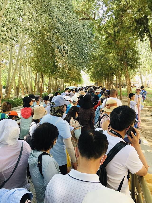 早饭后去莫高窟。正常参观门票238元/人,每天六千来张,100元/张的应急参观票12000多张(参观三个洞窟),分时段预约入园。九点钟停车场几乎停满汽车,还有源源不断开来自驾车、旅游大巴,我都怀疑网上预约限流是搞笑的吗?平心而论莫高窟的门票是我见到的最不地道的。一个景区两种游览形式,排队一小时参观五分钟,虽然能进的洞窟壁画非常精美,但是旅游体感极差,仅仅给人打卡景点,满足一下“我来过”的感觉。既然用防疫、保护的名义限流,那就按规定来。搞一个正常、应急门票,似乎是为游客考虑,给人“既当又立”的感觉。后来在茶卡盐湖碰见一对夫妇,他们去的是西千佛洞感觉就很好,我们路过看见这个景点提示,可是没有进去有点遗憾。
