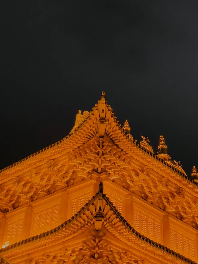 暮色四合之时,当五台山的其他庙宇都缓缓关闭了山门,广化寺却亮起了如梦似幻的灯火。红色大门在黄色灯光的映衬下更显得金碧辉煌,层层屋檐在星空下宛如天上宫阙,更添了一抹神圣之光。