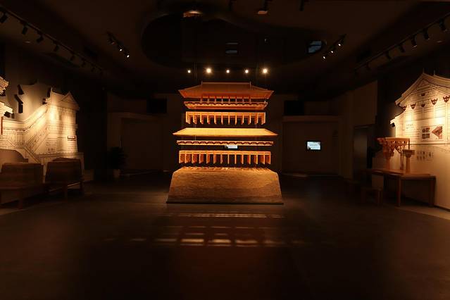 下面这个图是根据考古结果模拟建造的含元殿模型,大大的立在展馆中间,很有标识性,我看见有游客特意在这里摆Pose拍照。悄悄说一句,含元殿是自唐高宗搬来这里之后,大臣们上朝的地方。