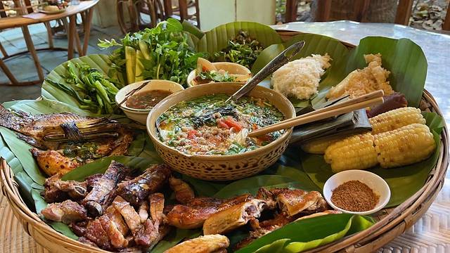 早上睡到自然醒,就打着车奔向机场,不得不夸夸这种离机场近的地方,时间拿捏的很稳,说来也是奇妙,早上在贵阳青旅碰到的游客,转身在机场相遇,到达酒店第一刻就赶着导航去第一家网红餐厅,从贵州到这的第一感觉呀就是瞬间温暖了许多,来到告庄,瞬间就穿越到了小东南亚,街上的一砖一瓦都那么的让人惊呼,走进餐厅,坐在小木椅上,来上整份的套餐,有烤鸡,排骨烤肉,旁边则是米线,糯米饭,非常典型的傣族餐啦,不过不说这分量实诚的让我一个人硬是吃了俩小时都没有吃完,所以强烈呼吁得拼餐。