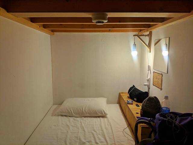 一灯,一桌,一床,足矣。空间是挺大的,环境也好,这是我住过感觉最好的胶囊,没有之一[哼唧]住胶囊旅馆最大的缺点就是晚上可能会听到别人打鼾的声音[doge](旅馆会免费提供耳塞)不过我是没关系