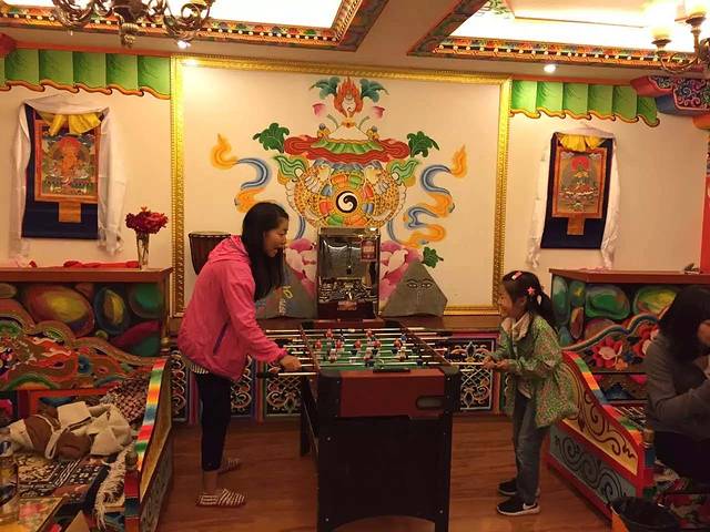 No.6(7.25),迎着蓝天白云走在卓克基吐司官寨里,感受着厚重的历史积淀和浓郁的藏寨风情。午后途中在4100M的梦笔山高程,稍作停留并未发现自己有任何的高反,对自己的身体素质又有了些许的自信。抵达四姑娘山的长坪小镇后趁领导们去考察住宿之际给远处的大姑娘山美拍一张,行囊安顿好立刻寻找美食,“烤全羊”可是路书上极力推荐的,当然味道也确实棒棒的。酒足饭饱回四姑娘山乡村客栈歇歇脚怡怡情,客栈大堂藏味十足的小镇酒吧氛围,除了桌上足球、啤酒、电影还偶遇了一酷帅歌手自弹自唱,两个丫头的交杯酒将大家的欢乐推向了高潮,相信若干年后她两会为此情此景相视而笑!
