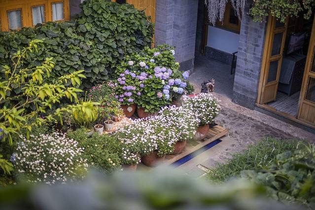 民宿是丽江古城传统的四合院样式,由原木建造,古韵十足~带有一个小花园,雏菊和绣球都开好了,整个氛围就特别安逸舒适,这就是属于丽江的美好~