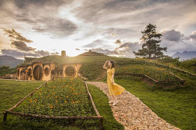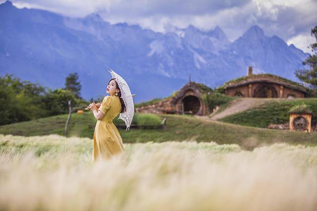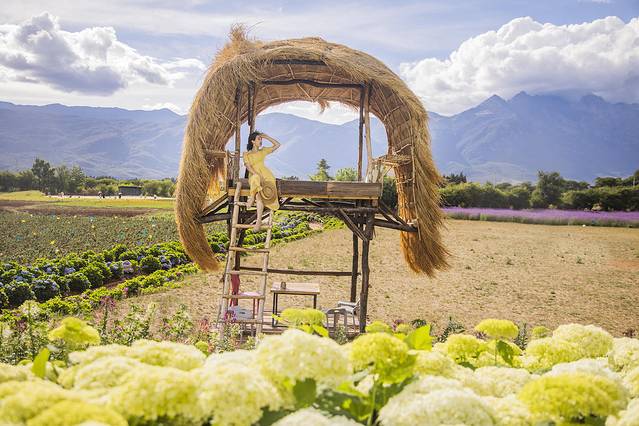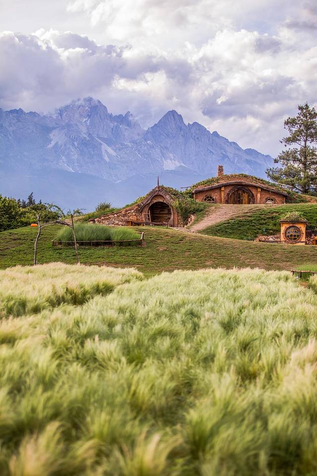 听花谷最经典的霍比特屋,总是会被婚纱摄影围绕,建议大家避开一下日落前的拍摄高峰时间,一般下午两三点的时候人会少一些,用长焦拍出小屋和雪山真的无比梦幻。小屋前还有一个小湖可以拍摄倒影,各种各样的鲜花随着季节更换,超级出片,尽这一个地方就能拍好久好久。