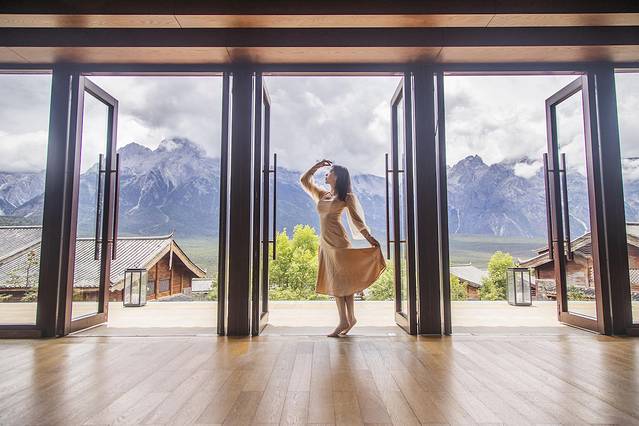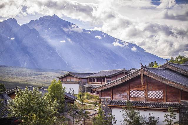 玉龙雪山景区内有且仅有这一家酒店,每间房都有超大阳台正对雪山。可以看到整片连绵的山峰,位置和角度得天独厚。早上醒来就能看到壮丽的日照金山,晚上天气好能看到满天星辰。
