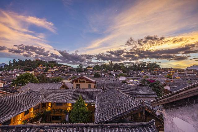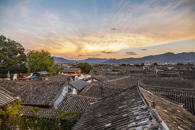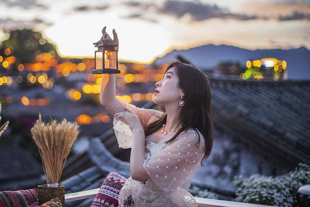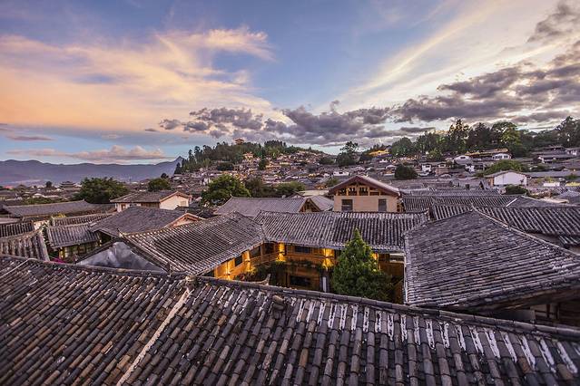 比起花园,我更喜欢的是屋顶露台,在这里可以俯瞰古城全景,还能看到玉龙雪山,日出日落都可以在这里欣赏到,晚上还可以观赏夜景,简直是完美。