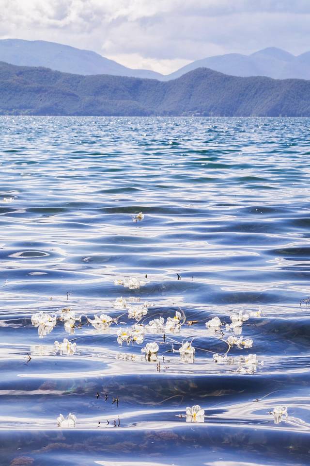 一簇簇洁白晶莹的花朵在湛蓝色的湖面上起伏飘荡,往远处看,青山如黛,舟楫往来。
