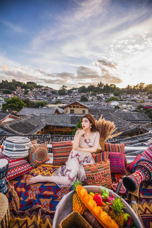 屋顶设计了榻榻米的样式,布置了波西米亚风格的抱枕、毯子、圆桌,直接躺在榻榻米上看丽江的晚霞简直就是无与伦比的快乐~看完晚霞再看夜景,丽江古城的美值得你慢慢等待!