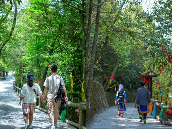 从尔玛古道漫步而行,和男友牵手,密林下的我们被斑驳的光影拉出了长长的影子照在古道石壁上,这一刻好像石壁上的人物们都鲜活的动了起来。