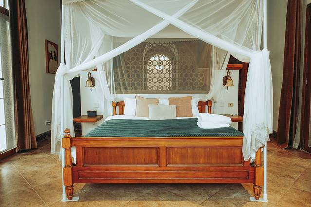 民宿是独栋的带泳池别墅,两个房间里分别有一张1.8米的大床,好适合两对小情侣来度假。