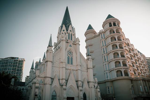 一栋栋欧式风情的建筑让人一秒穿越到了欧洲,哥特式教堂高高耸立,红色的巴士和电话亭是伦敦的味道。