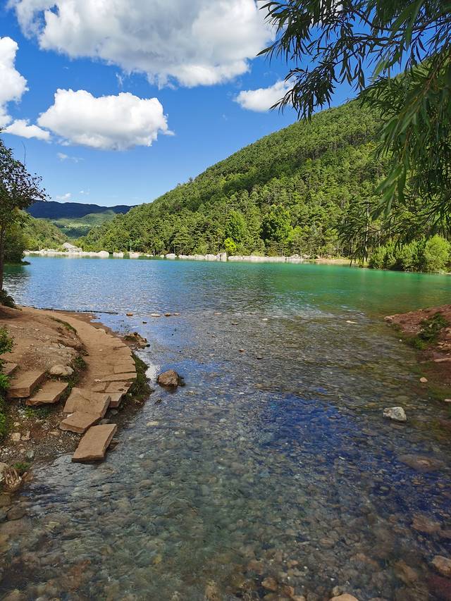 蓝月谷:索道下来之后坐大巴去的蓝月谷,大巴费用是包含在门票里面的,大巴下来第一站就下车,吃点东西,就去逛蓝月谷了。美得不像话的地方,孩子们可以在浅滩玩水。蓝月谷回古城的大巴车5点停班,我们玩得开心错过了班车,包的当地私家小车回去的,大约是23块钱一个人,比大巴车贵几块钱,还好。