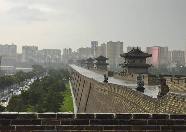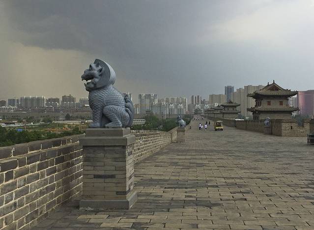 这时,天空中一下子变得乌云密布,不一会儿大棵的雨滴落下来,瞬间暴雨夹着雷鸣倾泻而下,幸好城墙楼的屋檐较宽,大家都躲在下面。暴雨下了好一阵,地上积满了水,后来雨小下来,我带着雨伞,但鞋子不行呀。又等了一会儿,肚子开始饿了,还是下去找吃的吧。
