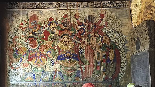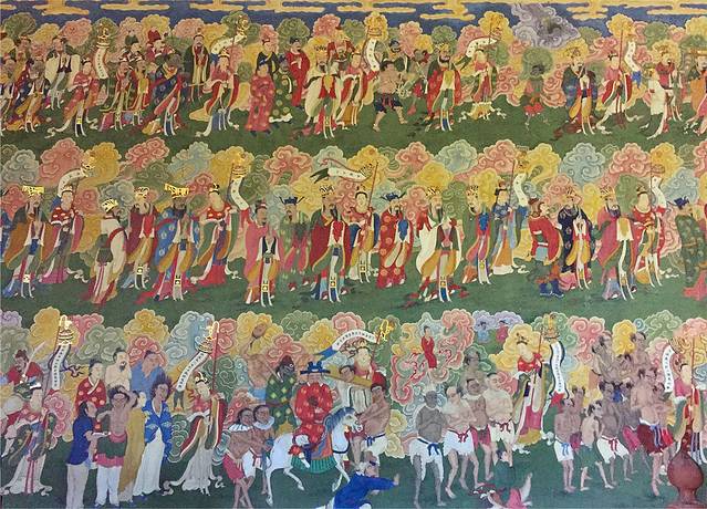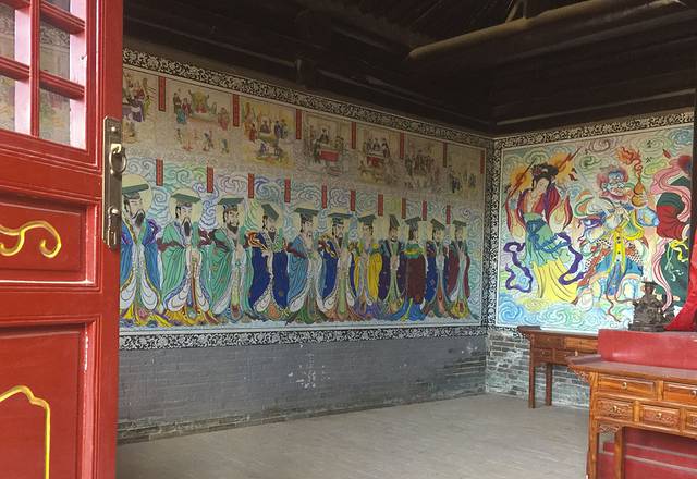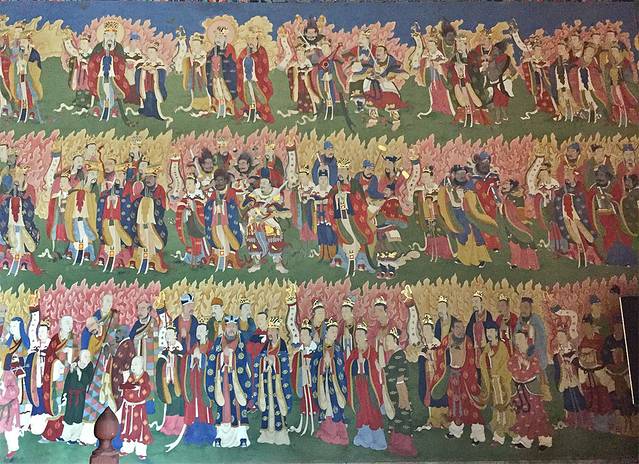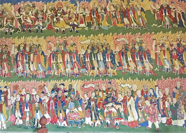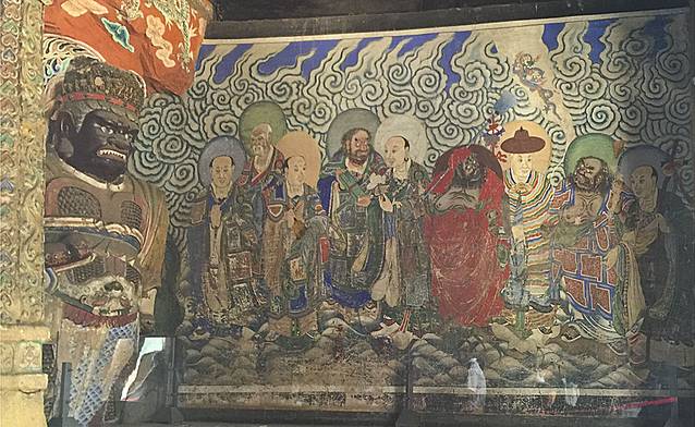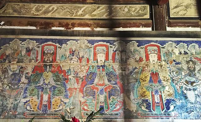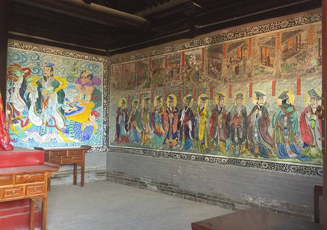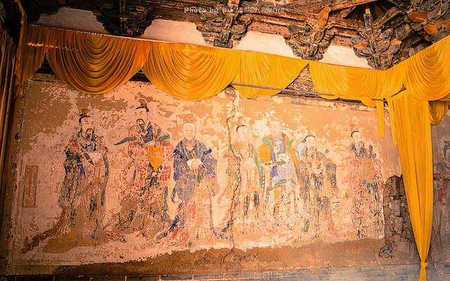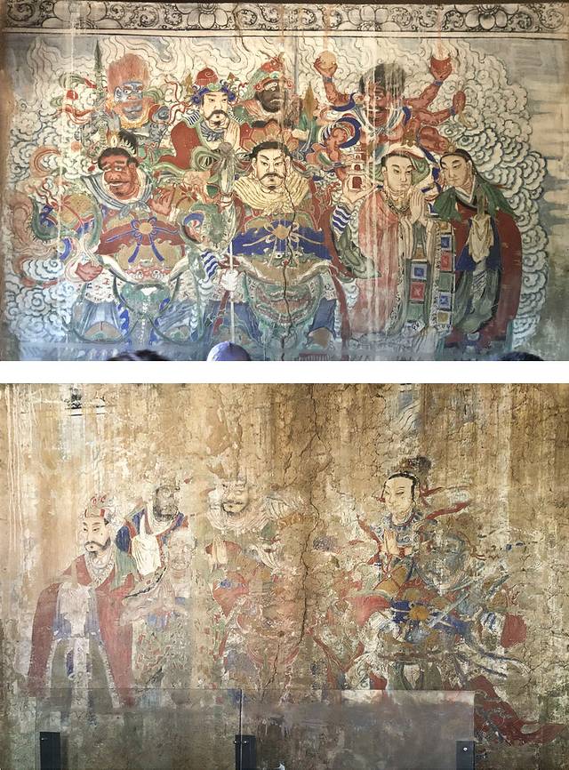三面殿墙满绘壁画,重彩平涂,立粉贴金,金碧辉煌。画面人物众多,形态各异,栩栩如生,令人叹为观止。