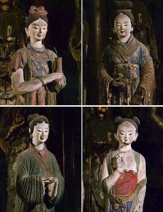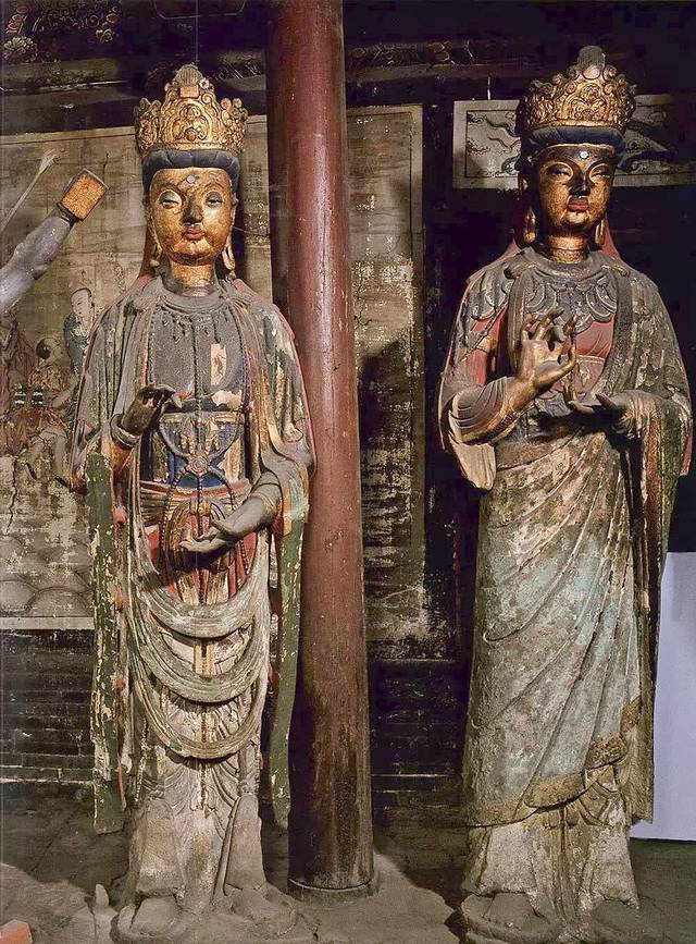 进门一看,殿内的明代文物太丰富,有多尊明代泥塑佳作。殿堂正面建有高大的须弥座,上塑巨大的三世佛重金妆塑像,面目丰满,肃穆庄严。释迦佛座前有迦叶、阿南二弟子侍立,座下及两厢是高大的护法天王和十八罗汉彩塑,宽衣博带,束发连冠,形态逼真,比例适度,衣饰流畅,姿态自然。特别引人注目的是三世诸佛背光上的悬塑飞天、伽兰、金刚力士等,设计独特,颇具匠心,而且塑像基本完好。