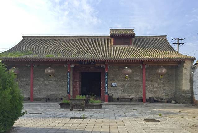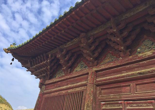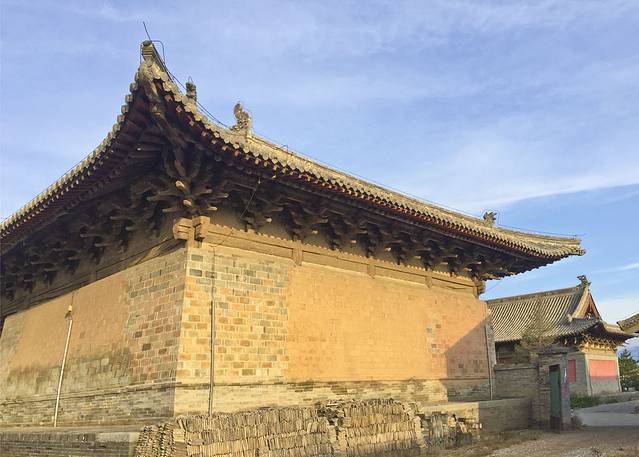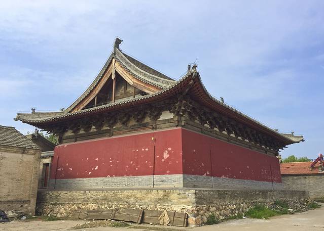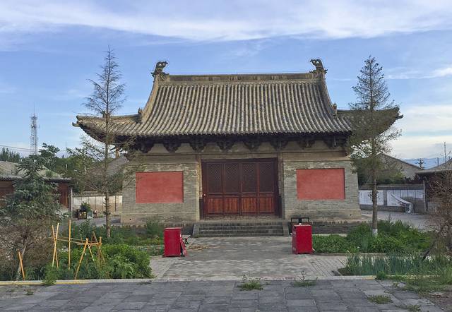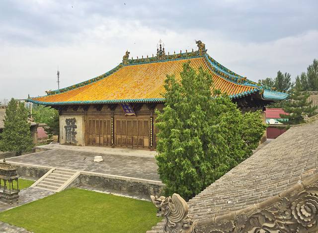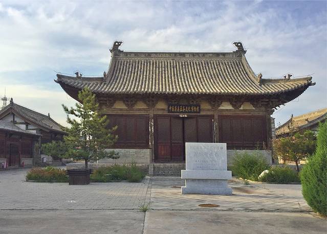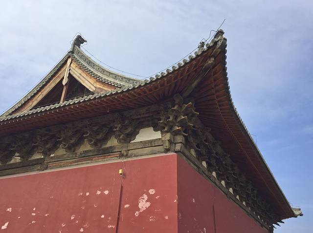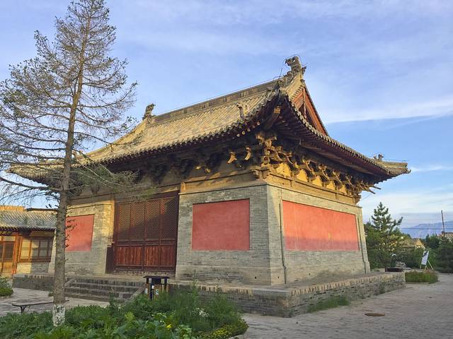 108路约一小时多点到达阳高汽车站,再乘镇内公交11路,按地图在差不的地方下车,却发现还是在修,也不知山门在哪里。绕到另一面是个单位,院子倒是让进,走到里面看见一个寺院的后门,可里面锁着,又往旁边寻找时,出来一个老太太,赶紧过来但人走了门已关上,上来轻轻一拉却是刚才老人没关紧。进院找到大雄宝殿,很是漂亮,建筑风格最具特色。