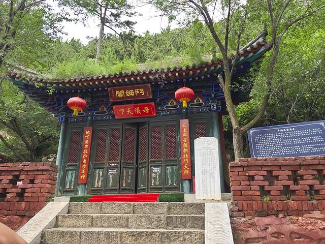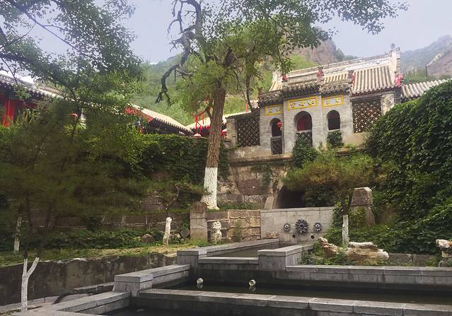 又在旁边饭馆要上一个素菜和米饭,回房间吃。饭后休息,也许没睡好有点头疼。2:00多去水母宫走走。水母宫也是张家口的一个旅游风景区,建于清乾隆四十七年,有山有水似个森林公园。水母宫依山就势,碧瓦朱门,宫前为青砖牌坊,上书“水母宫”三个金色大字。山下有一股喷涌清泉,让景区有些意趣。而当年张家口与北方少数民族贸易互市, 成为我国最大的毛皮集散地,于是人们发现了经水母宫这泉水浸泡、洗鞣的毛皮,皮板柔软,毛色铮亮,于是商家集资跨泉修建了这座水母宫。