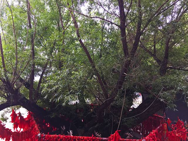首先见到的是那古柳二株盘抱而生,高12-13米,粗30-40围,相传为明代所栽,奇怪的是向东横卧的一株主干中空,腹内长出一株松树。造型美观,古树成精的模样。只是围着她找了半天也不知那株松树在那里,挂满了祝福的红带,看不很清楚里面。问了寺中人,告之中间那一米多高的树干便是,可那分明不是树,还是死了只剩下树于?