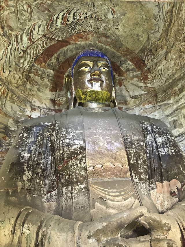 第十九窟,主像是三世像,窟中的释迦坐像,高16.8米,是云冈石窟中的第二大像。窟外东西凿出两个耳洞,各雕一身8米的坐像。