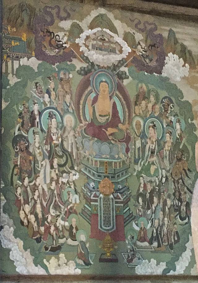 管理这座殿的女人走过来,便同她攀谈起来,她听说我刚去过永安禅寺,便立刻让我进入殿内,请我给她讲讲壁画的故事,很有认真精神的一个人。交流中她告诉我之前她有严重的失眠症,人瘦得风能吹倒,自从来到这里工作,每天有佛主相伴,心里安静下来,失眠慢慢好了,人也恢复成现在这样正常了。呵呵,听了她的故事我感觉好生神奇,佛教给人的力量真是如此之大,能让烦躁的人心静,战胜世间烦忧,战胜自已,真是不可小觑。