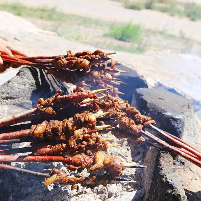 早上10点出发,2个小时穿越戈壁沙漠,12点左右到达中间休息站,在沙漠绿洲的大树下,开始丰盛的午餐——干果,西瓜,哈密瓜;桃子,果汁,杏皮水;烤土豆,烤青菜,红柳大串不落下&……作为一个资深小吃货,这一part我要重点讲讲,第一感受是能在沙漠里能吃上一口西瓜、喝上一口杏皮水,哇塞塞,那简直犹如久旱逢甘雨~第二必须要说说这里的特产——红柳烤肉,那真的也是一绝,羊肉一点羊膻味都没有,香味独特,肉质鲜美,外焦里嫩,油腻适中,香喷喷滋啦啦,超级好吃,据说是漠葛家的秘制烤肉,还是在野外河边直接生火烤,真正的野外烧烤,当然了,你也可以让师傅教你,经过自己手的食物也会吃着更香,会更具纪念。这也应了一句话——旅行的味道,吃过才知道(hiahiahiahiahia)。