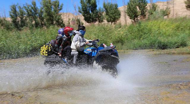 No.1.乘坐ATV越野摩托,一定要穿裤装!一定要穿裤装!一定要穿裤装!(重要的事情讲三遍),因为这种穿越方式体验感胜在刺激,上坡下坡,真的是可以用飞沙走石来形容的。沿途大漠的广阔一览无余,会经过遍地黄沙,石头山壁,小溪绿洲(这就是大泉所在区域啦),平地处疾驰,体验一把速度与激情。