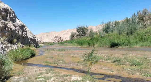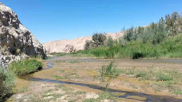 饭后休息片刻,我们在沙漠中的绿洲中嬉笑玩闹。绿洲真的是沙漠里很美丽奇特的地方,像是绝境中的希望,又像是暴风雨中的港湾,让人心生宁静、温馨。在这里我看到了一种很好看的植物,任性的采摘了几束,据说这是这边独特的芦苇,细长有葱绿。在绿洲里我们像孩童一样玩耍,自由自在,清澈见底的溪水潺潺流过,骑车者在浅水区一跃而过,飞溅的水花溅湿了裤脚,不亦乐乎。在沙漠中,水分总是蒸发得很快,湿润的衣裤很快就晾干,但是这份亲近自然放松自我的喜悦却永远留在了我心中。