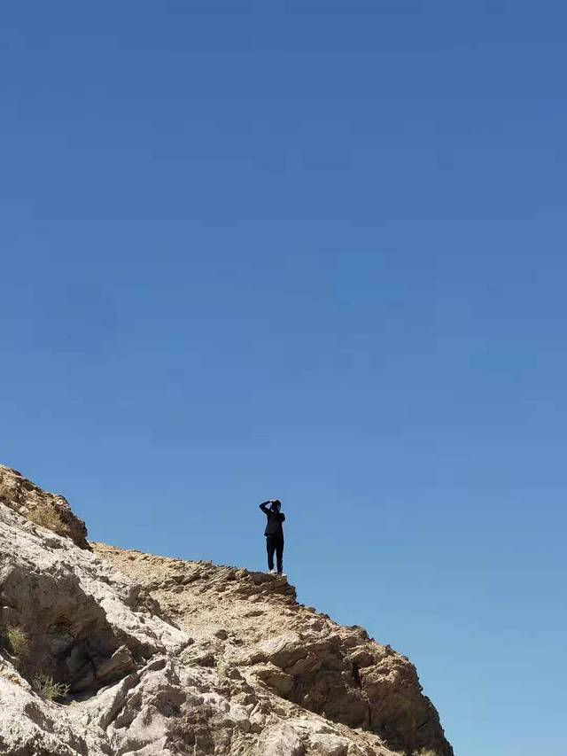 爬上了山顶,驻足此处,光芒万丈的不是佛光,而是无遮拦的坡顶,从哪个角度都能感受到无尽的光芒,环绕四周看到的是是一望无垠的沙漠,宝蓝色的天空虽然和淡黄色的沙漠没有那么的搭配,但是天很美,沙漠也同样美丽,我不禁想到“谁说鸟和鱼不能相爱”。
