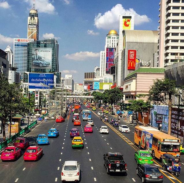 泰国出行坐公交是免费的,的士也很便宜。如果马路那头远远地有一抹骚气外露,这车多半你就能招手来坐。泰国公共交通工具车常见颜色有荧光粉,橄榄绿,石榴红,柠檬黄,深海蓝。