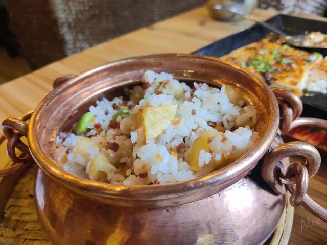 里面有外酥里嫩的土豆块块、咸香口的云腿粒,还有豆子胡萝卜丁,小铜锅焖出米饭粒粒分明,夹杂着配料的香气,推荐!