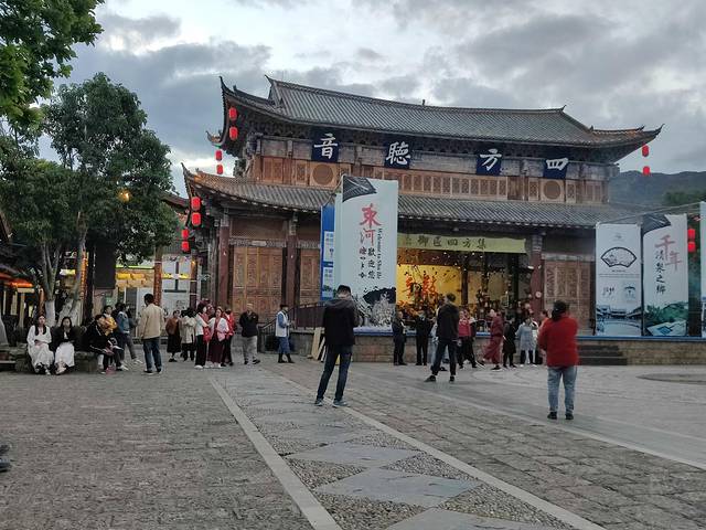 跳舞的广场在镇中心叫四方听音,算是束河的固定项目,一般晚上八点前到这等着,有工作人员来支火盆放音乐,还有穿着民族服饰的领舞。