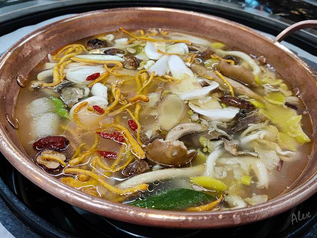 腌制过的腊排骨带着淡淡的咸味,吃起来近似广东咸骨粥;锅里沸腾的鲜香菌菇味让人食欲大开。