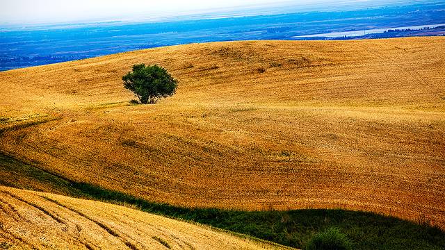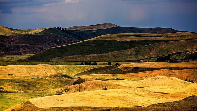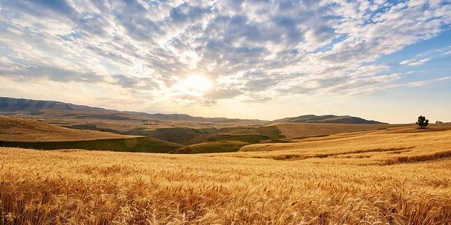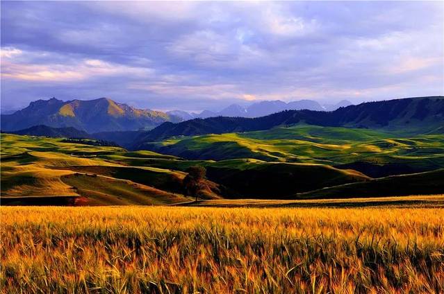 浅山处是金色麦浪和草地
