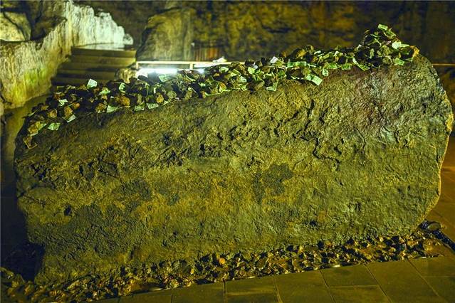 洞中因为“不见天日”,到处都潮湿,一步一步仿佛走带着水滴,尤其是“棺材石”上带着水滴更是应景,“棺材棺材,摸摸升官有发财,”导游很可爱,总有那么多的说辞来渲染气氛,听完这话很有朋友去摸,我也试了,其实求升官发财何必呢,这烦扰的人世间,平安就好……