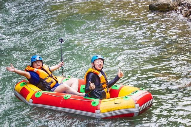 既然来了这,刺激的漂流是少不了的。从一开始坐上皮艇,穿上救生衣那一刻,刺激漂流就开始了,在时而湍急时而平缓的水流中顺流而下,我们在与大自然抗争中演绎精彩的瞬间,只剩尖叫,忘却烦恼。这就是这场漂流带给我的感受,虽然是夏天,水打在身上还是很凉爽的,真是欢快极了。