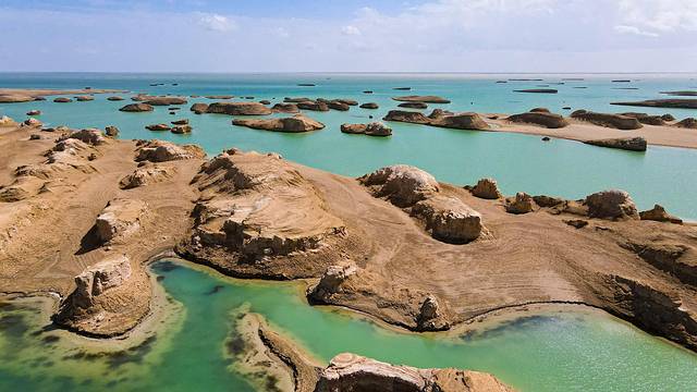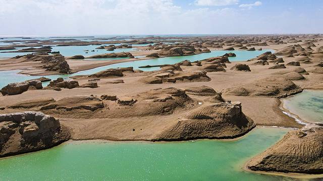 在大自然鬼斧神工下,雅丹里遍布的土丘与蔚蓝湖泊相互交融,形成一片50余平方公里的水上雅丹奇观,美到了极致;
