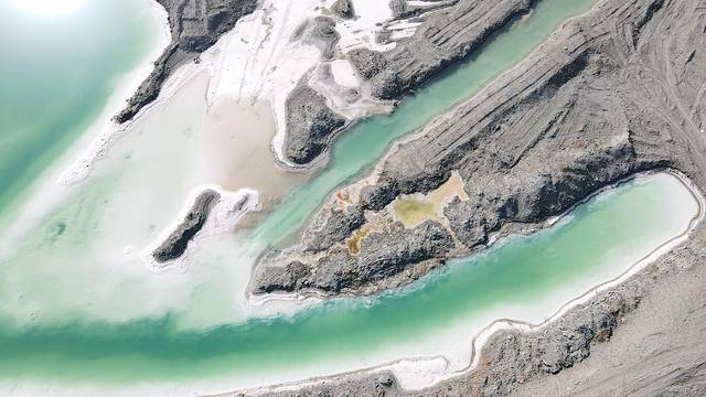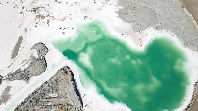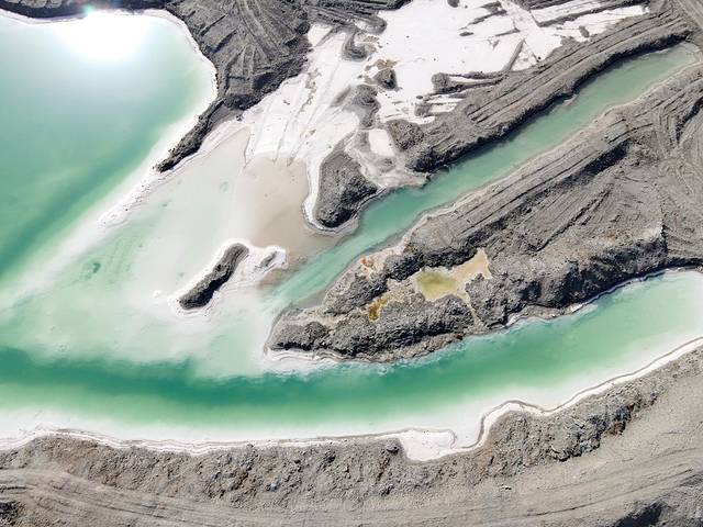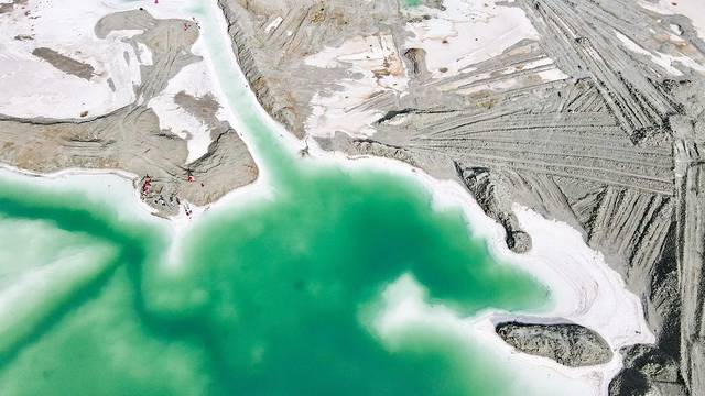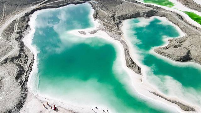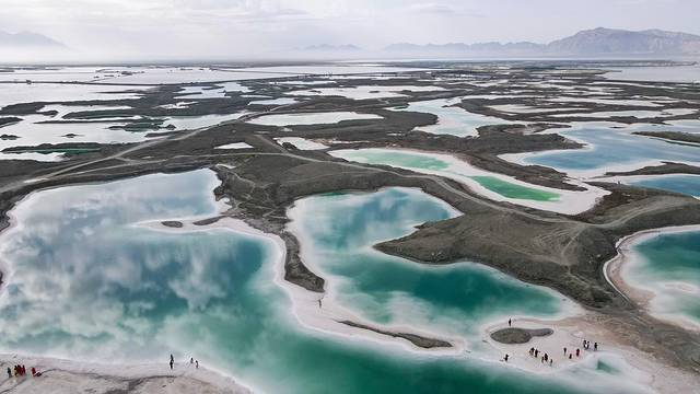 这片大小不等、形态迥异,深浅不一的湖泊是历经多年的盐湖开采而形成的采坑;