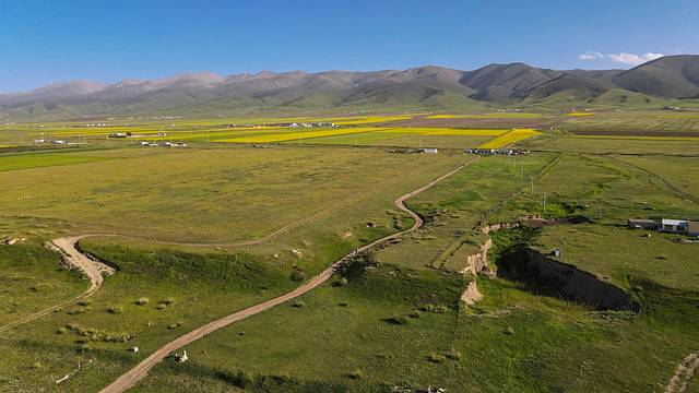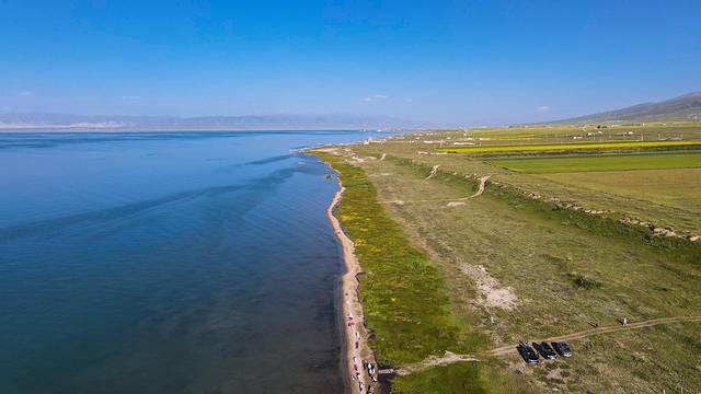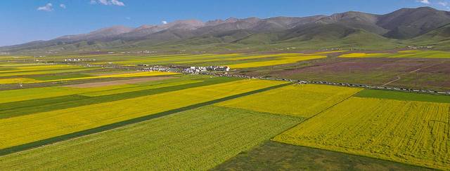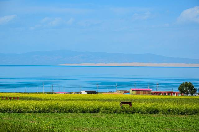 环湖千亩的油菜花竞相绽放,高山牧场的野花五彩缤纷;数不尽的牛羊膘肥体壮,那蓝锦缎似的湖面上,起伏着一层微微的涟漪,平静的湖面呈现出静谧的幽蓝色;