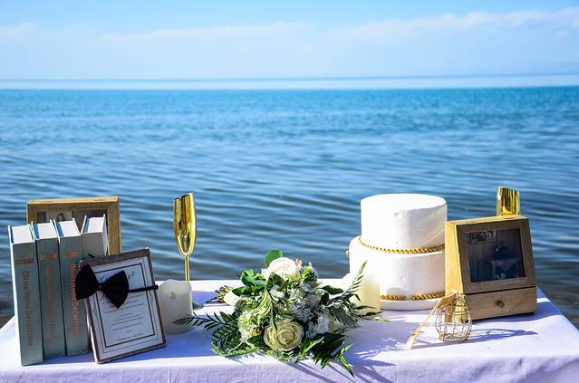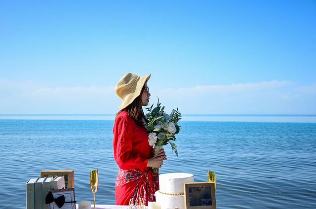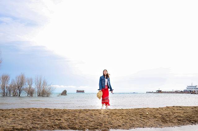 在湖边看到有拍婚纱照的,正好借用了一下道具拍照;