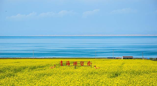 其实临近 青海湖 沿途的油菜花就很美,到 青海湖 时已经有点堵车了,住宿还在前面,要是先开到住宿办理了入住,再开车折返回来看花拍照,会花很多时间;堵车也很麻烦;我们就在附近湖边找了块油菜地把车停了;看油菜花每个人需要给10元的费用;