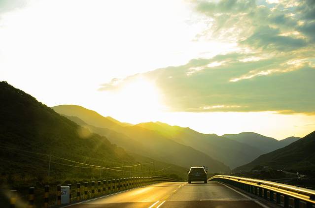 在车上其实也可以有很多素材可以拍,可以拍一张夕阳的余晖洒满公路;